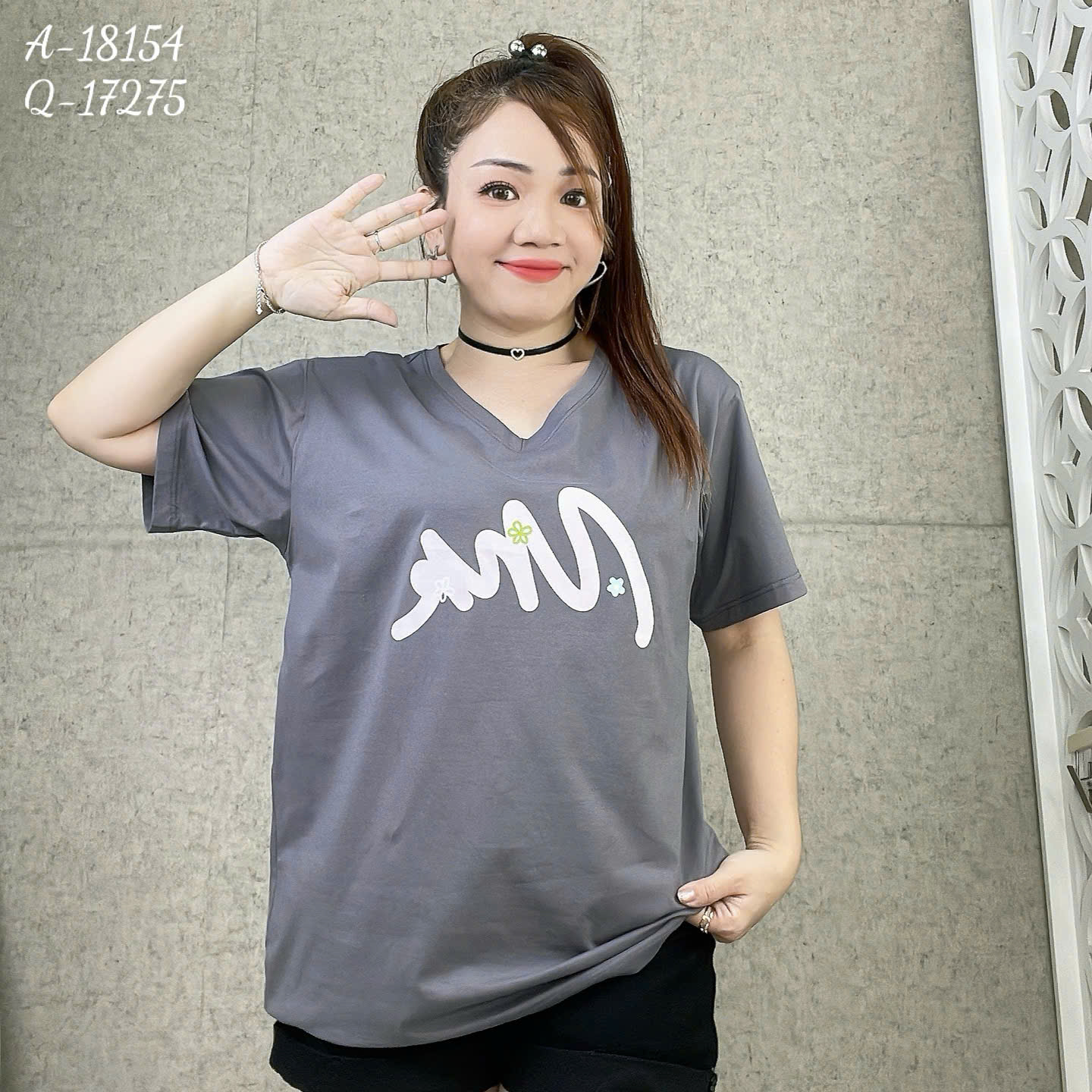 S00210- Áo thun BIGSIZE Quảng Châu cổ tim MNR, chất mịn đẹp, co giãn - 18154 - XÁM
