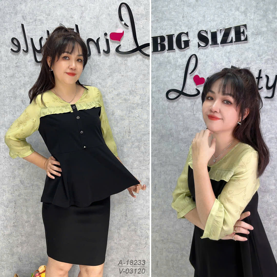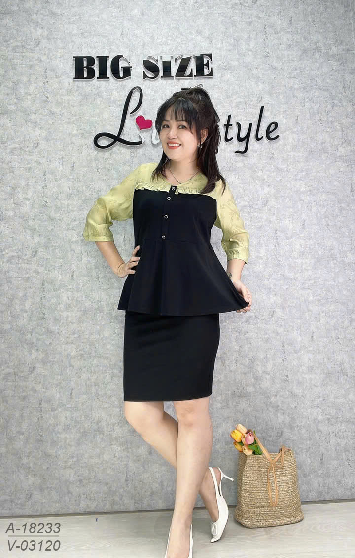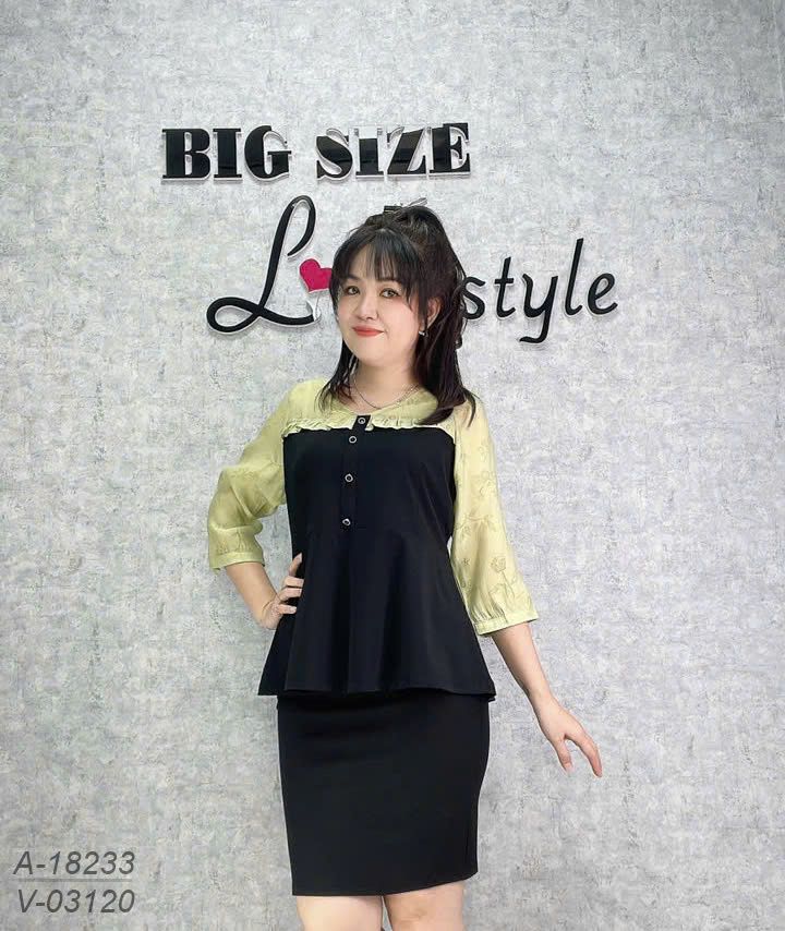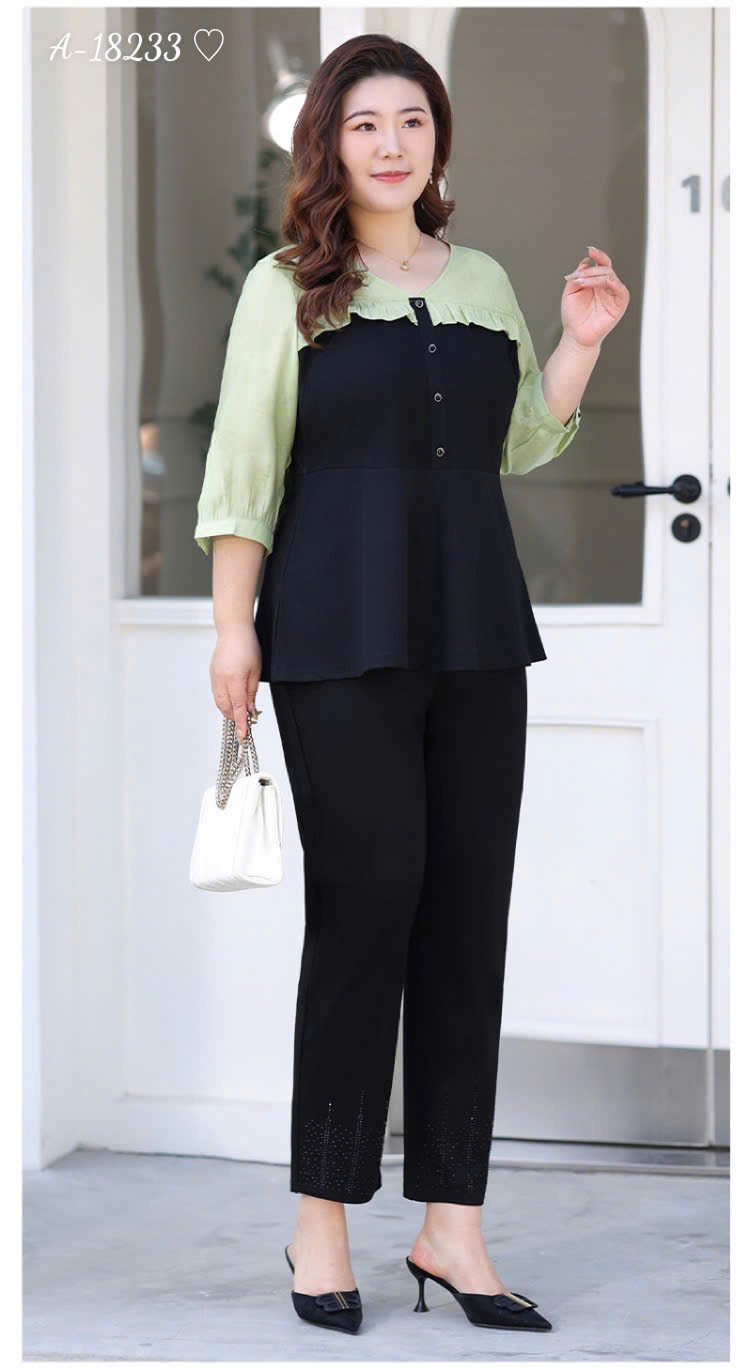✔ Áo kiểu PeplumBIGSIZE QCCC che bụng phối tay xanh, nữ tính thanh lịch- 18233