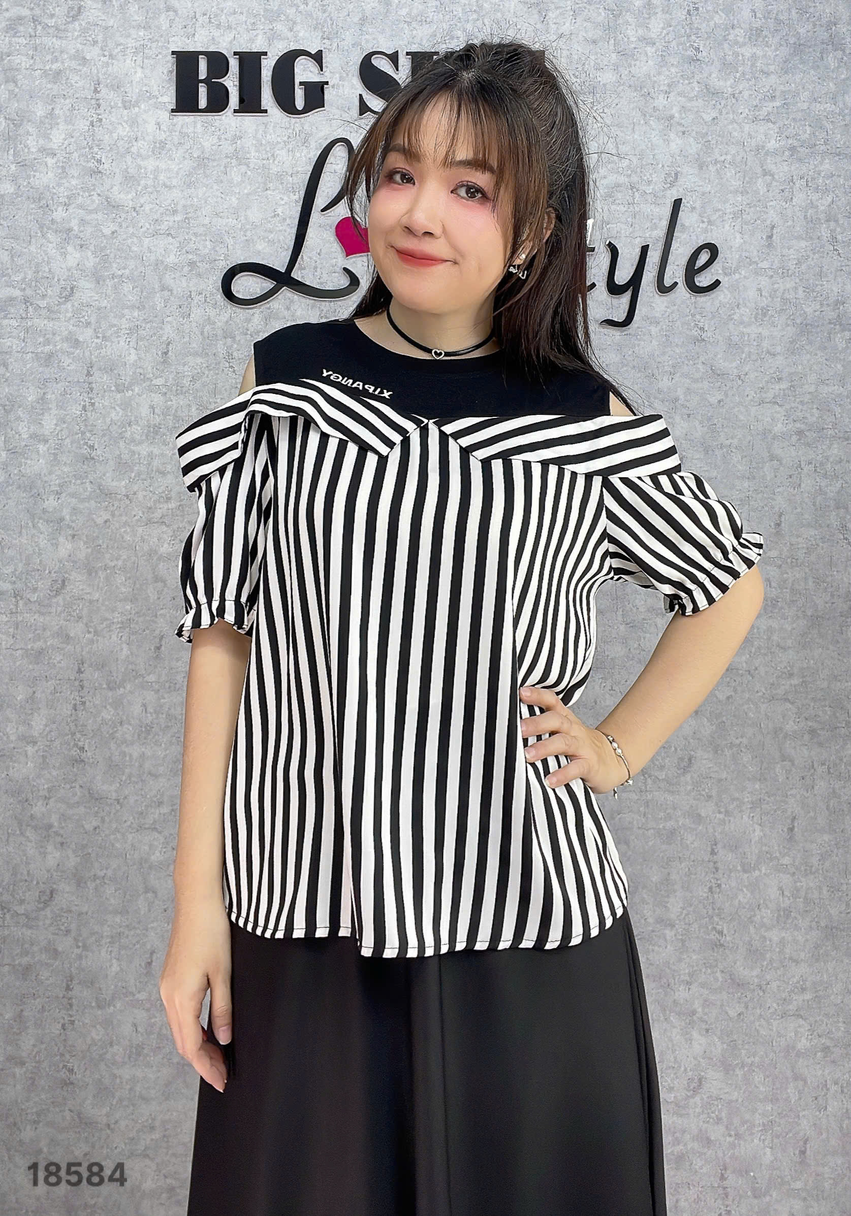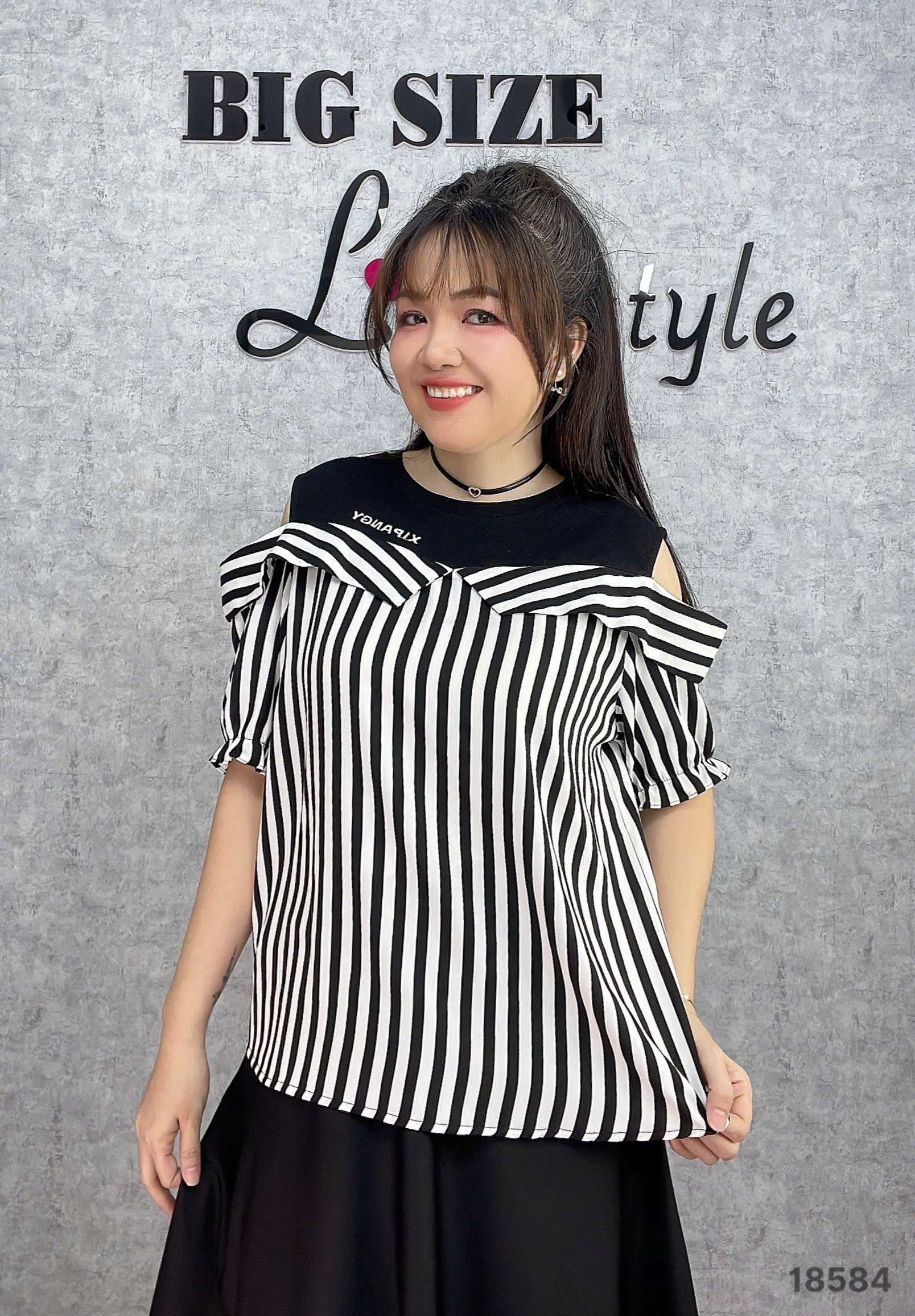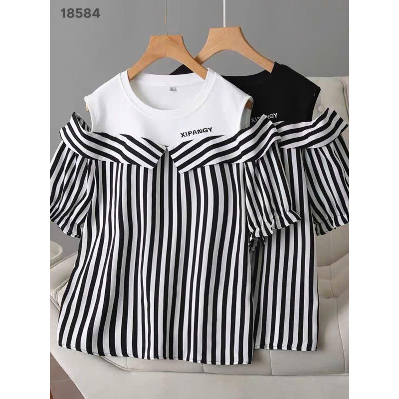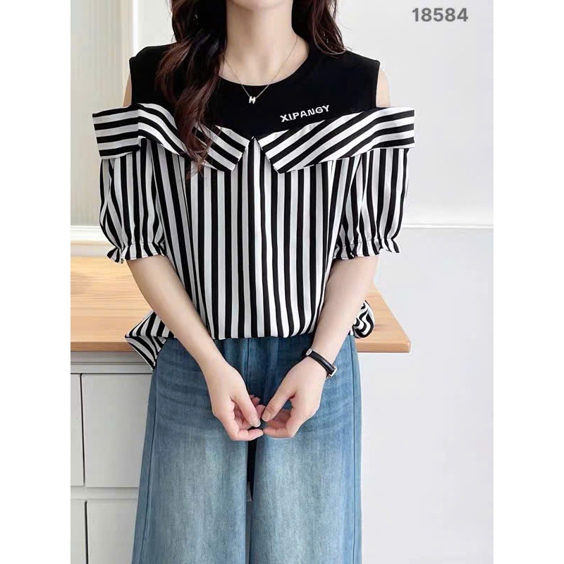 ✔ Áo kiểu rớt vai BIGSIZE QC chất lụa đẹp phối thun co giãn kẻ sọc mặc hack dáng -18584